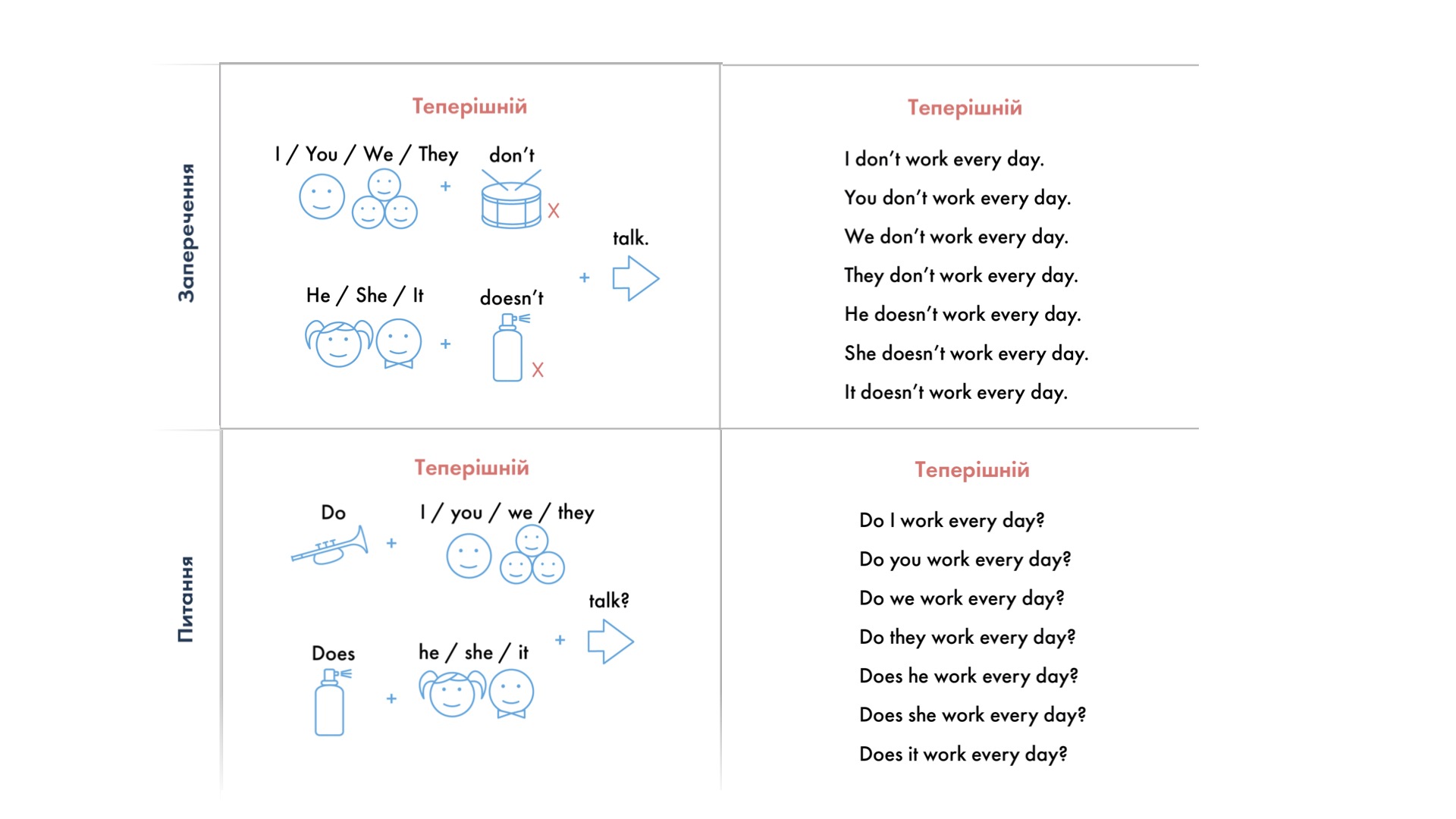 На заняттях з курсу Граматики 1.0 ви навчитеся думати як англійці та будувати прості правильні англійські речення в 6 базових формах теперішнього, минулого і майбутнього часу.